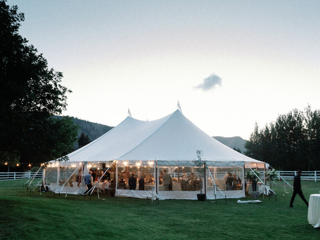 A grassy venue in the middle of Sun Valley with a huge tent, tucked next to a little creek.
